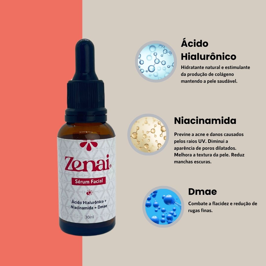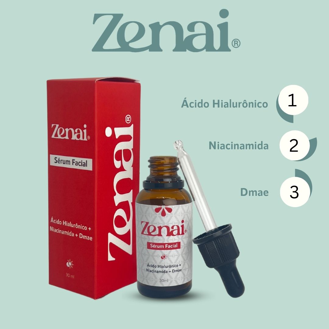 Características: O Sérum Facial Zenai é uma combinação poderosa de ingredientes ativos, incluindo ácido hialurônico, niacinamida e DMAE, desenvolvida para promover uma pele mais firme, hidratada e revitalizada. Com 30ml de fórmula concentrada, é ideal para quem busca hidratação profunda, redução de linhas finas e uma pele com aparência rejuvenescida. Este sérum é vegano, livre de parabenos, e não testado em animais, sendo seguro e eficaz para todos os tipos de pele. Benefícios: – Hidratação intensa com ácido hialurônico, que melhora a elasticidade da pele. – Reduz a aparência de linhas finas e rugas, deixando a pele mais lisa e jovem. – Niacinamida auxilia no controle da oleosidade e melhora o tom da pele, ajudando a minimizar manchas. – O DMAE proporciona firmeza e efeito lifting natural, promovendo uma aparência mais tonificada. – Produto vegano, sem crueldade animal e livre de parabenos. Composição: Hydroxyethyl, Acrylate, Sodium Acryloyldimethyl Taurate Copolymer, Isoxadene, Polysorbate 60, Água, Niacinamide, Hyaluronicalcid, Dimethylethanolamine, Perfume. Modo de Uso: Aplique de 3 a 5 gotas do sérum na ponta dos dedos ou diretamente no rosto, evitando a área dos olhos. Espalhe o sérum uniformemente pelo rosto e pescoço, usando movimentos ascendentes e suaves, massageando até que o produto seja completamente absorvido. Precauções: – Produto de uso externo, não ingerir. – Evite contato direto com os olhos. – Em caso de contato acidental com os olhos, enxágue imediatamente com água em abundância.